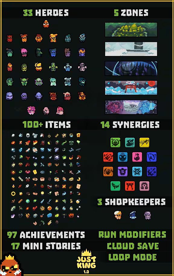 A fast-paced roguelike kingdom builder. Grow your empire and fight massive battles against powerful rival kings. Break the game with thousands of insane builds to become the King of Kings.