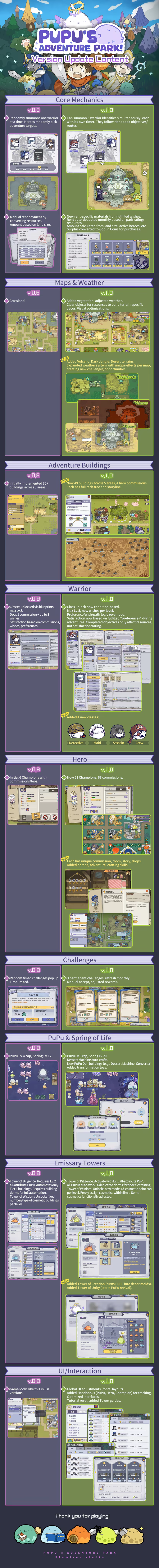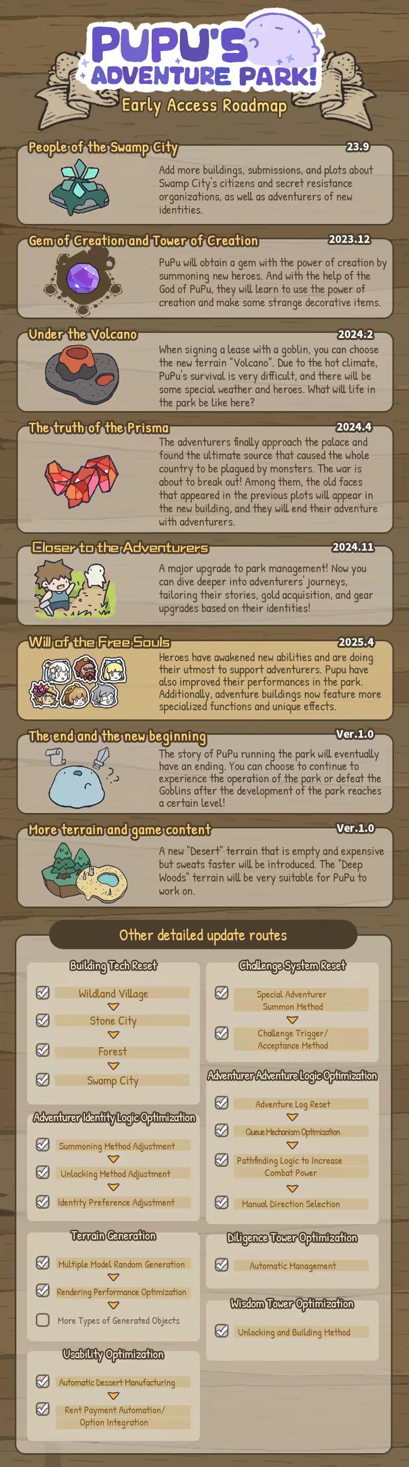The PuPu clan set up shop on this new lease - an Adventure Park - attracting "heroes" who are summoned through the Goblin's powers to pay a visit. The PuPu Adventure Park is meant to be an unforgettable adventure for the heroes, while the PuPu clan works hard to build park facilities to satisfy park visitors!