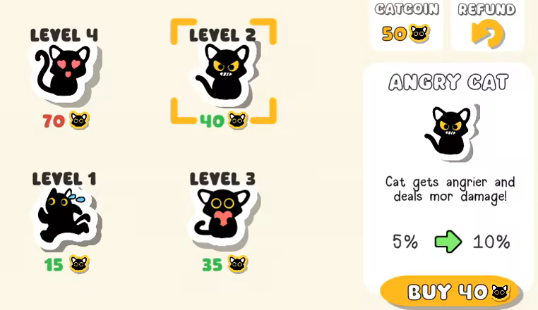 After each run, you can purchase permanent upgrades or new cats to play with!