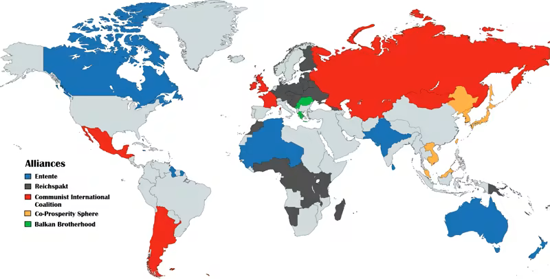 Following a brutal war with no tangible gains, both France and the United Kingdom succumbed to communist rebellions. The French Commune and the Union of Britain were established, while the exiled governments fled to North Africa and Canada, respectively. As Britain fell, territories such as Gibraltar, Cyprus, and Malta were seized by other nations. New Zealand joined Australia, the British Raj split into the loyalist Raj and the independent Indian State, and South Africa voted to leave the Empire. The Caribbean colonies of Britain and France were annexed by Canada.