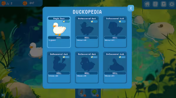 The game features different types of ducks, that each give unique bonuses. You get to decide which ducks you want to buy for your pond. They will even move into a small hut if your pond starts getting overcrowded. Check out the duckopedia to find the latest info and bonuses of each duck.