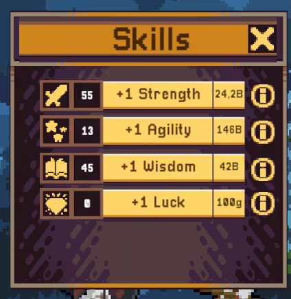 Then there's the Skills tab - your character will progress through these. More Strength, more raw damage. There's a number of factors that alter the value of Strength that you will discover along the game. Agility increases your critical strike chance, and Wisdom increases the damage bonus each critical hit benefits from.