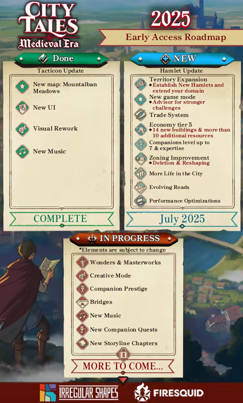 Become the leader your people need, shaping their districts and providing them with the means to thrive and expand your grand kingdom. But donβt fret my Liege; you are not alone. Companions with invaluable skills will aid you in this endeavour as their fates become intertwined with your City Tales.