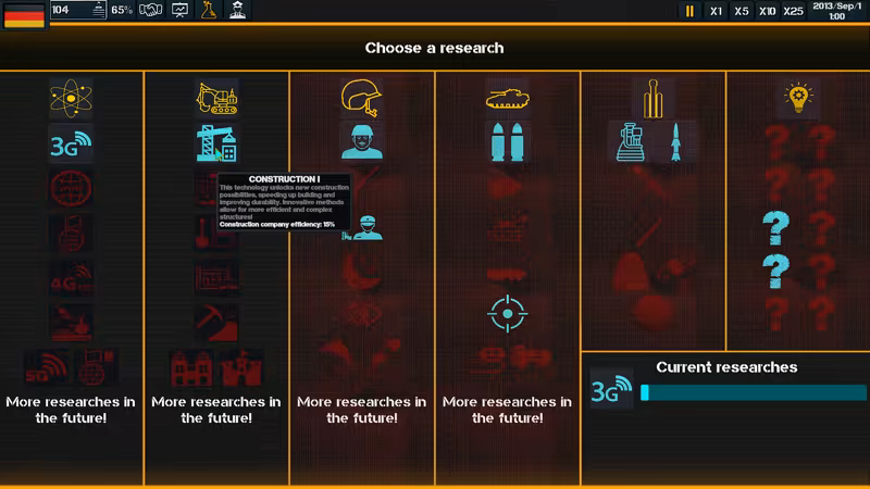 Use the budget menu to edit expenses and efficiency in various sectors of the country, such as construction, research, army, and administration. Hire additional construction companies to speed up building! Don’t forget about taxes as well!